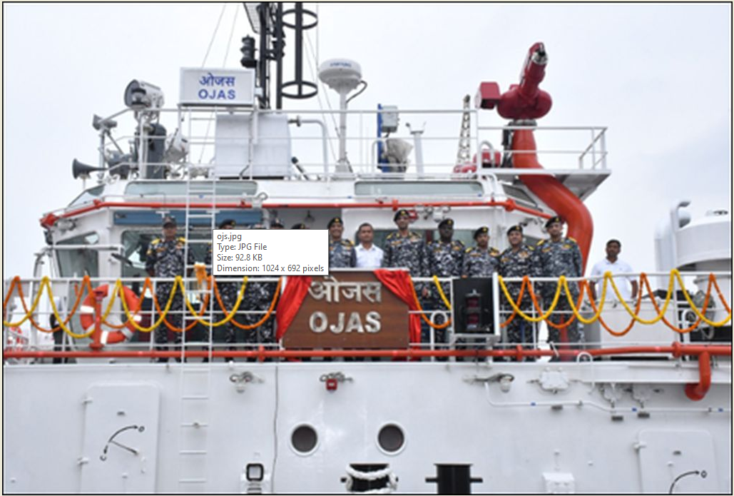 This agile tugboat was procured under a November 12, 2021, contract with Titagarh Rail Systems Limited (TRSL), Kolkata, to build six such tugs. All vessels, including Ojas, have been design‑to‑build domestic productions, adhering to Indian Register of Shipping standards. Ojas is tasked with pivotal roles in assisting naval ships and submarines during berthing, un-berthing, and maneuvers in confined harbours. Additionally, it enhances operational safety with afloat firefighting capabilities and limited search-and-rescue support.