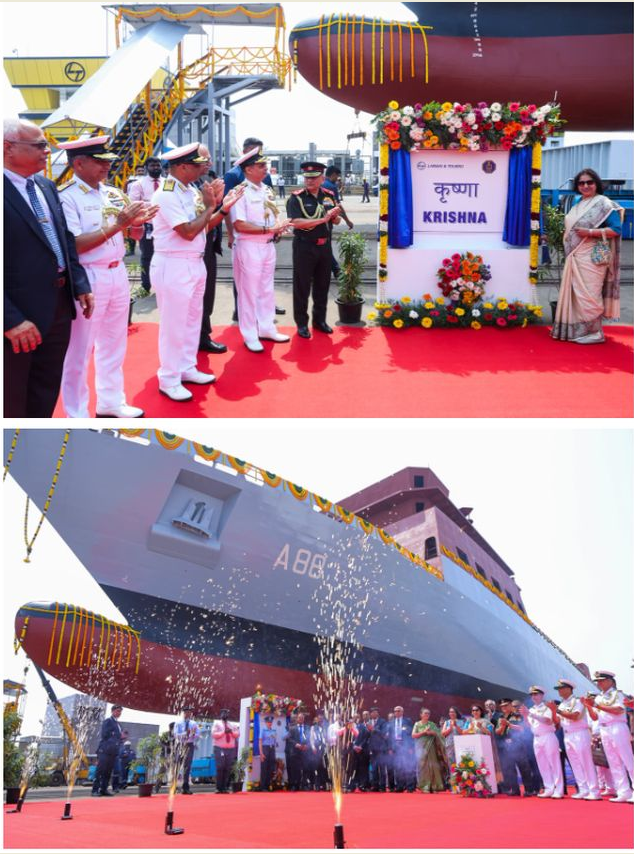 Yard 18003 (Krishna), the first of the three Cadet Training Ships (CTS) under construction at M/s L&T, Kattupalli (Chennai), has been launched on 16 Feb 2026. In keeping with the Naval traditions, Mrs Anupama Chauhan launched the ship in the presence of General Anil Chauhan, Chief of Defence Staff. Senior officials of the Indian Armed Forces and M/s L&T Shipbuilding, Chennai attended the event.