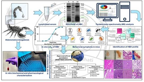 The study, spearheaded by Prof. Ashis K. Mukherjee, Director of IASST, and Ms. Susmita Nath, research scholar, among others, found that the secret behind the danger of the sting lies in 25 distinct toxins spanning eight different protein families packed in the venom that the scorpion injects. Spectrometry and biochemical analyses identified the 25 key toxins from 8 protein families in HBV. The researchers carried out pharmacological effects in Swiss albino mice and found that the chemicals lead to systemic toxicity, increased liver enzymes, organ damage, and a pronounced proinflammatory response.
