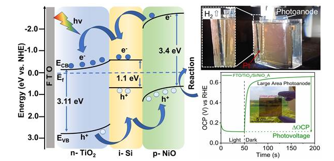 Led by Dr. Ashutosh K. Singh, the research team designed a state-of-the-art silicon-based photoanode using an innovative n-i-p heterojunction architecture, consisting of stacked n-type TiO2, intrinsic (undoped) Si, and p-type NiO semiconductor layers, which work together to enhance charge separation and transport efficiency. The materials were deposited using magnetron sputtering, a scalable and industry-ready technique that ensures precision and efficiency. This thoughtful engineering approach allowed better light absorption, faster charge transport, and reduced recombination loss, key ingredients for efficient solar-to-hydrogen conversion.