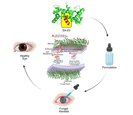 L V Prasad Eye Institute in Hyderabad, in collaboration the Bose Institute in Kolkata, an autonomous institute under the Department of Science and Technology, Government of India, have designed a 15-residue peptide, named SA-XV, derived from a larger host-defense peptide, S100A12. This peptide, previously shown to inhibit fungal growth, has been characterized for its antifungal potency and mechanism of action.
